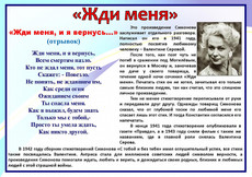 Константин Симонов - российский писатель, сценарист, редактор и военный корреспондент. Участник боев на Халхин-Голе и Великой Отечественной войны. Полковник Советской Армии. Заместитель генерального секретаря Союза писателей СССР. Герой Социалистического Труда. Лауреат Ленинской и шести Сталинских премий. После публикации его стихотворения «Жди меня» миллионы людей в войну повторяли его строки как заклинание.